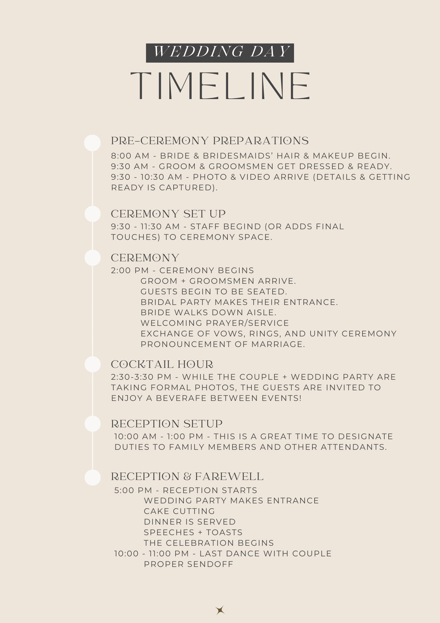 Lucky for you, I’ve created a customizable template that all you have to do is copy the information of your wedding day into this template! Your itinerary should include: dates and times for all wedding events (ceremony, cocktail hour, dinner, toasts, and other activities planned). Be sure to include your entrance to the ceremony/reception, first dances, cake cutting and any other significant moments - this is for everyone to be on the same page!